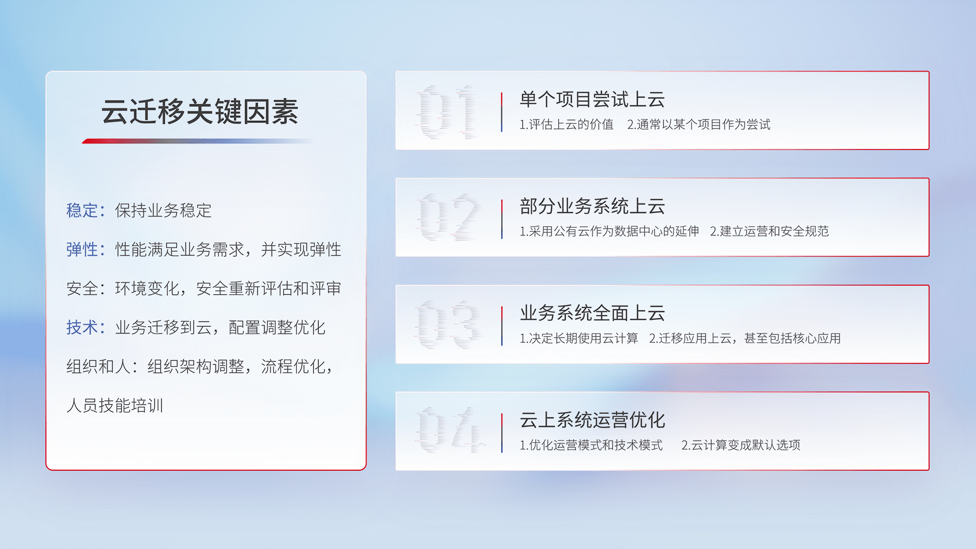 结合实际业务,,从规划设计、、、、云平台选型、、云原生改造、、数据迁移、、集成交付,,,,迁移全过程为客户识别最佳上云路径,,,,做好风险识别管理,,设计网络架构、、身份权限、、安全审计合规、、、操作审计、、、、日志审计、、、监控告警策略、、、、多站点容灾设计等,,对云上基础设施进行整体规划,,,,提升IT治理水平,,,以满足弹性、、高可用、、、高性能的需求。。