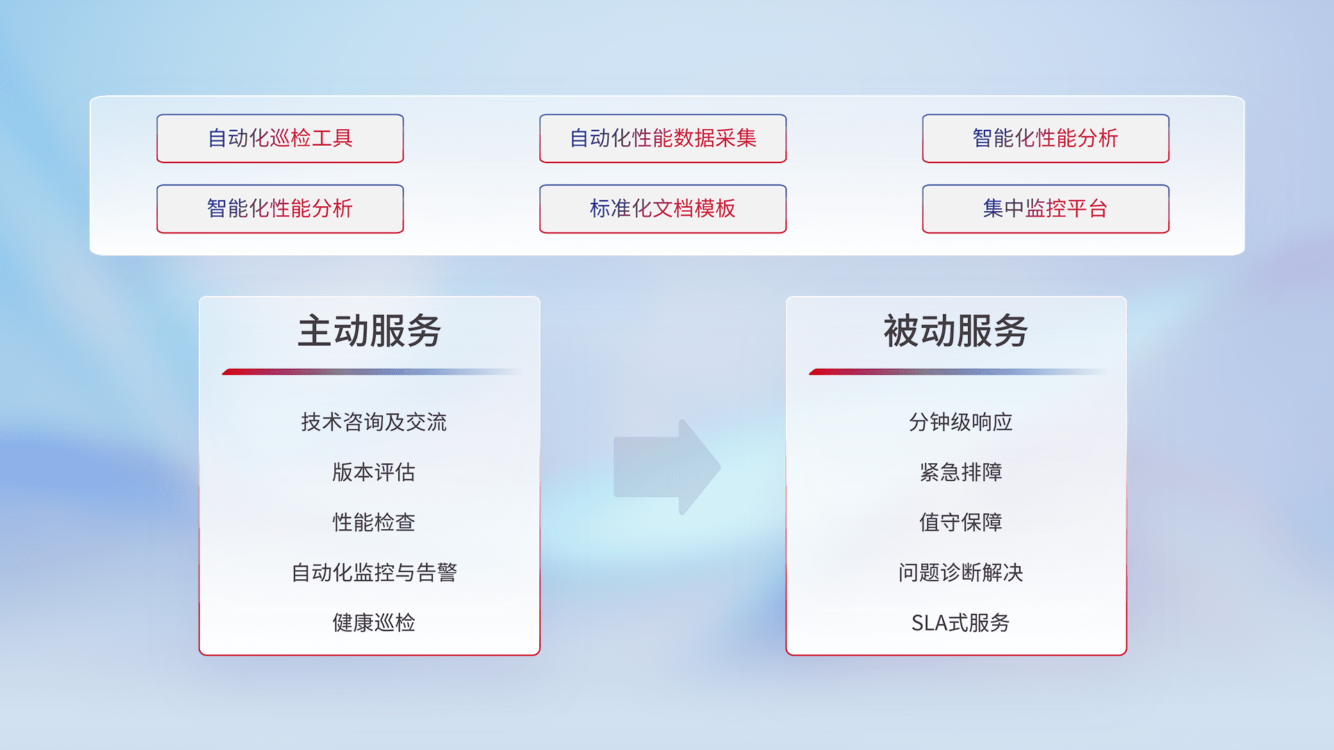 智能化工具和标准化文档,,,,保障服务质量,,提供主动服务(包含技术咨询、、版本评估、、、性能检查、、自动化监控与告警、、、、健康巡检)和被动服务包含(分钟级响应、、紧急排障、、、值守保障、、、、问题诊断解决、、SLA服务)。。