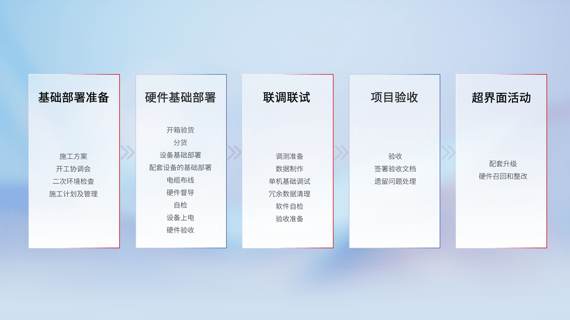 从基础部署准备、、、硬件基础部署、、联调联试、、、项目验收、、、、越界面活动的全过程可追溯,,,,保证施工质量和进度。。